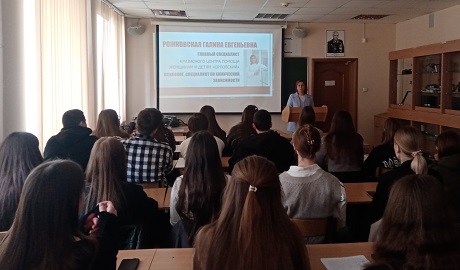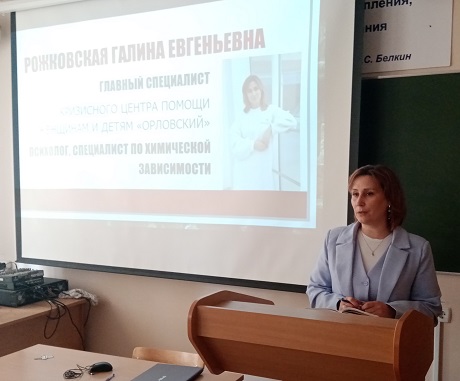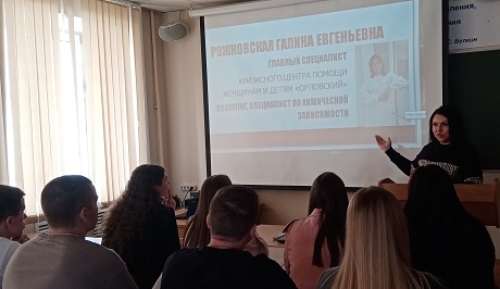14 мая 2025 года состоялась встреча студентов 2-4 курсов Юридического института с главным специалистом «Кризисного центра помощи женщинам и детям «Орловский», психологом, специалистом по химической зависимости, практиком, который непосредственно занимается профилактикой наркотизма и реабилитацией людей с зависимостями, Галиной Евгеньевной Рожковской.