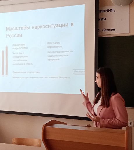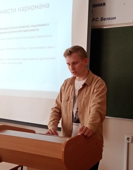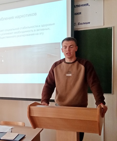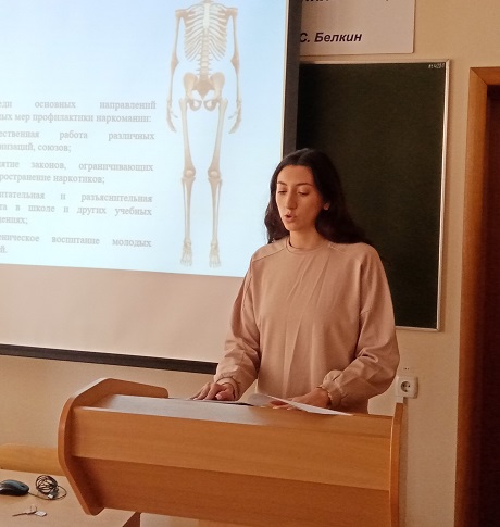 В начале мероприятия с приветственным словом, выступила доцент кафедры уголовного права и процесса Елена Александровна Маслакова. Она поблагодарила собравшихся участников за проявленный интерес к обсуждению проблем противодействия наркотизму и наркопреступности и отметила, что наркомания – это не просто болезнь, от которой умирают десятки тысяч людей, это огромное социальное зло. Затем с докладами и авторскими презентациями выступили студенты 3-4 курса юридического института ОГУ. Выступающие рассказали об истории появления наркомании, остановились на ее социальных и психологических причинах, подробно рассмотрели механизм формирования наркотической зависимости, внешние и поведенческие признаки болезни, обсудили вопросы юридической ответственности за немедицинское употребление и незаконный оборот наркотиков, предусмотренной законами Российской Федерации.