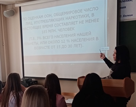 В 1987 году решением ООН 26 июня признан . Этот день объединяет всех, кто выступает за свободу от наркотической зависимости и борьбу с наркоторговлей. Проблема наркомании является одной из наиболее актуальных как для здравоохранения, так и для общества в целом. Это обусловлено тяжелыми медицинскими и социальными последствиями злоупотребления психоактивными веществами, среди которых на первом месте находятся характерные изменения личности. В преддверии этого дня кафедрой уголовного права и процесса был проведен круглый стол (14.05.2025) на тему: «Наркотизм как негативное социальное явление в российском обществе» среди студентов Юридического института. Организаторами круглого стола выступили: к.ю.н., доцент, доцент кафедры уголовного права и процесса Е.А. Маслакова и к.ю.н., доцент, доцент кафедры уголовного права и процесса Л.А. Абашина. Данное мероприятие проводилось в рамках воспитательного проекта «Мы выбираем жизнь без наркотиков», реализуемого кафедрой.