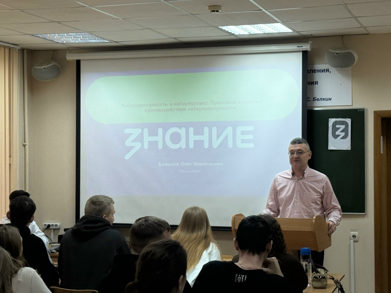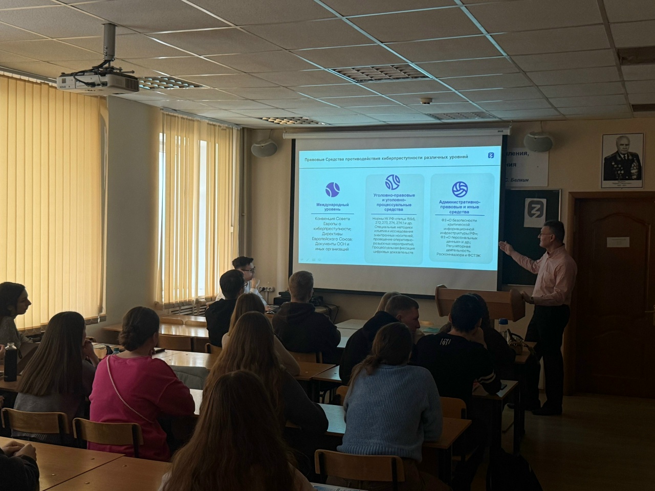 5 декабря 2025 года доцентом кафедры уголовного права и процесса ОГУ имени И.С. Тургенева Олегом Николаевичем Баженовым бала прочитана лекция, посвященная правовым средствам противодействия киберпреступности. Слушатели ознакомились с основными проявлениями киберпреступности, такими как кибекрмошенничество, вредоносные ПО, узнали способы утечки персональных данных, кибершпионажа, рассмотрели проблему противозаконного контента. Были также определены механизмы правового противодействия киберугрозам различных уровней.
