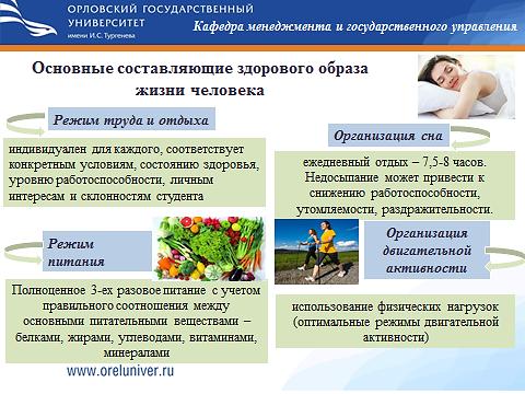 В ходе беседы были рассмотрены составляющие здорового образа жизни человека, такие как: режим труда и отдыха; организация сна; режим питания; организация двигательной активности; выполнение требований санитарии, гигиены, закаливания; профилактика вредных привычек; культура межличностного общения; психофизическая регуляция организма; культура сексуального поведения.