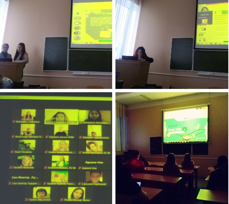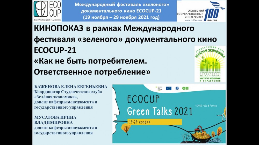 Студенты направления подготовки 38.03.02 Менеджмент и участники Студенческого клуба «Зелёная экономика» с 19 ноября по 29 ноября 2021 года принимали участие в кинопросмотрах в рамках кинопоказа Международного фестиваля «зеленого» документального кино ECOCUP Green Talks 2021.