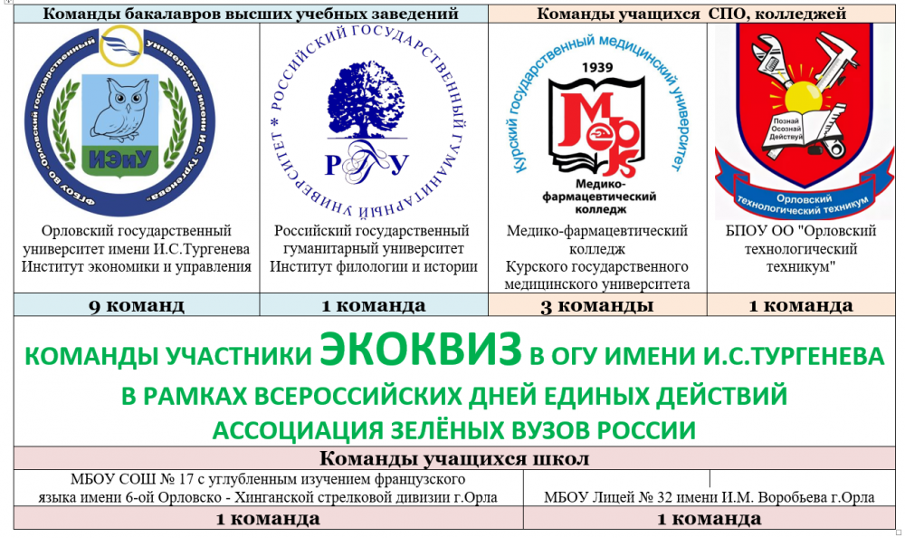 В Экоквизе по теме грамотного обращения с отходами приняло участие более 100 человек. Среди участников команды студентов не только ОГУ имени И.С.Тургенева, но команды из других регионов России. К нам присоединились ФГБОУ ВО Российский государственный гуманитарный университет, Историко-филологический факультет (г.Москва), Медико-фармацевтический колледж Курского государственного медицинского университета (г.Курск).