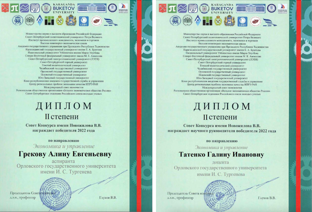 В рамках проведения V ВСЕРОССИЙСКОЙ НАУЧНО-ПРАКТИЧЕСКОЙ КОНФЕРЕНЦИИ С ЗАРУБЕЖНЫМ УЧАСТИЕМ «ЭКОНОМИКА И ИНДУСТРИЯ 5.0 В УСЛОВИЯХ НОВОЙ РЕАЛЬНОСТИ» (ИНПРОМ-2022) в Санкт-Петербургском политехнической университете Петра Великого состоялся конкурс научных работ имени В.В. Новожилова, в котором приняла участие и стала победителем (2 место) аспирантка кафедры менеджмента и государственного управления Грекова Алина Евгеньевна. Под руководством к.э.н., доцента Татенко Галины Ивановны была подготовлена конкурсная работа на тему: «Инновационная среда для развития инновационной политики территории на основе принципов «умной» специализации».