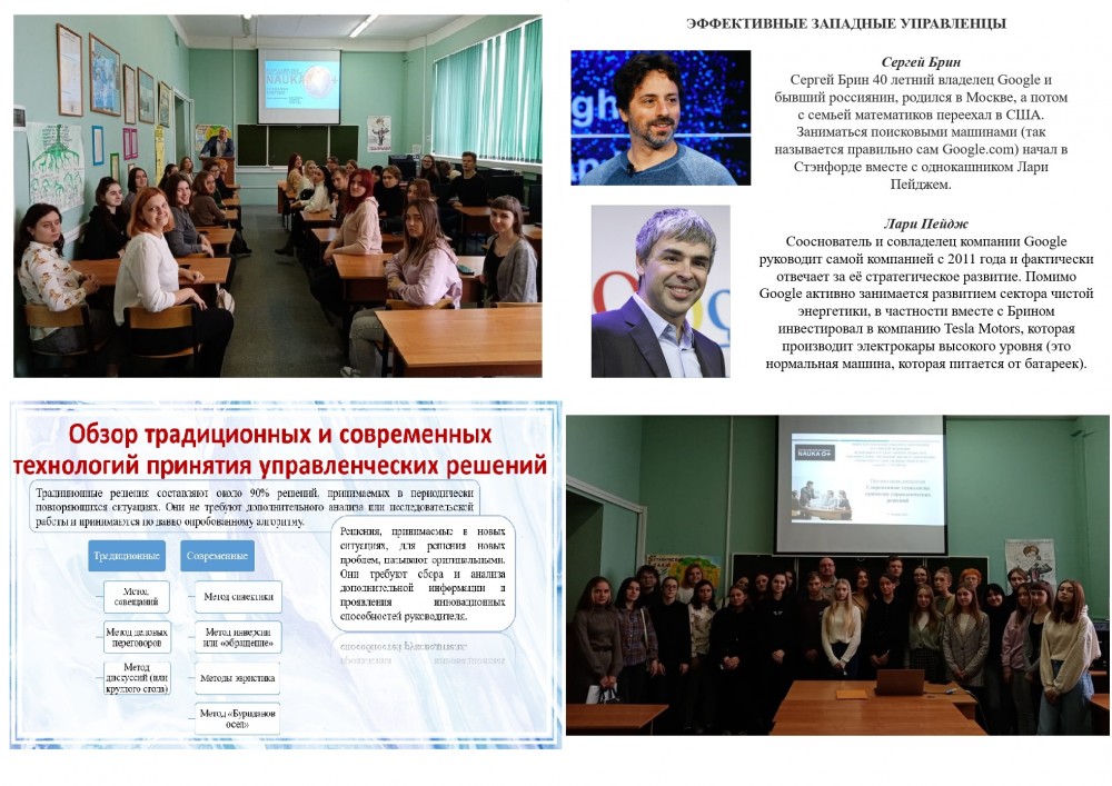 Далее была проведена групповая дискуссия на тему «Использование современных технологий принятия управленческих решений в деятельности отечественных и зарубежных компаний», в результате чего были выработаны основные компоненты современного менеджмента, способствующего повышению эффективности деятельности предприятий на основе использования современных технологий управления. Были рассмотрены презентации, характеризующие деятельность современных компаний.