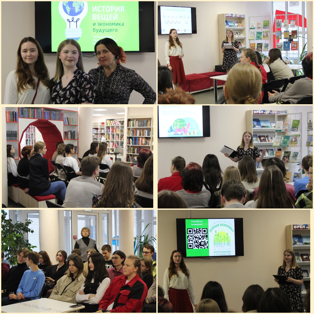 16 марта 2023 года в Центральной городской модельной библиотеке имени А.С.Пушкина в рамках участие команды "Зеленая экономика" во Всероссийском марафоне единых действий "Студентам экосвет" от Ассоциации "зеленые вузы" России была проведена открытая лекция на тему "История вещей и экономика будущего".