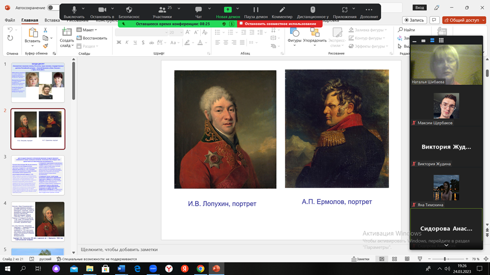 Преподаватели кафедры менеджмента и государственного управления д.э.н. Шибаева Н.А., к.э.н. Збинякова Е.А., к.э.н. Сучкова О.Е., и студенты заочной формы обучения по направлению подготовки 38.03.04 «Государственное и муниципальное управление» 24 марта 2023 года на платформе ZOOM провели беседу-диспут по теме «Беззаветное служение своему Отечеству: государственные деятели Российской империи – Алексей Ермолов и Иван Лопухин». В онлайн диспуте приняли участие студенты, проживающие в разных регионах Российской Федерации.