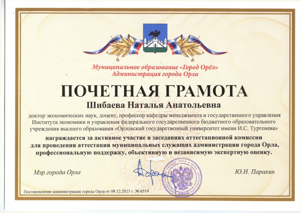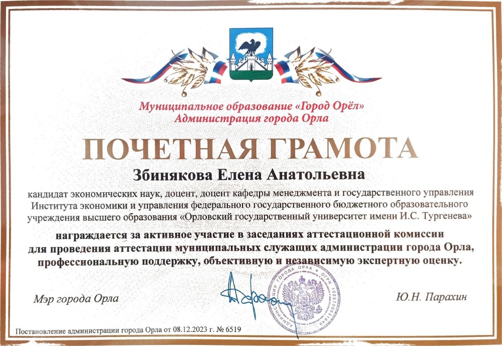 Преподаватели кафедры менеджмента и государственного управления награждены Почетными грамотами Администрации города Орла за активное участие в работе административной комиссии по аттестации муниципальных служащих города Орла.