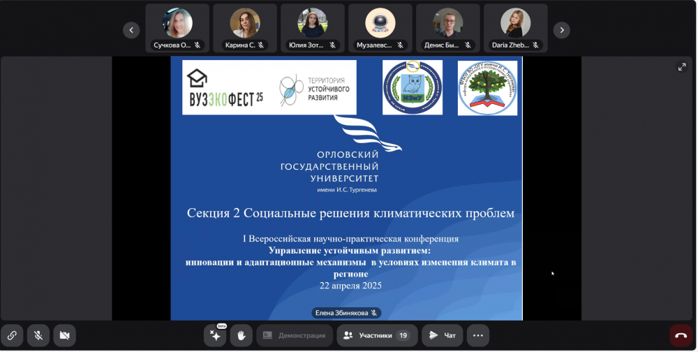 22.04.2025г. в рамках I Всероссийской научно-практической конференции «Управление устойчивым развитием: инновации и адаптационные механизмы в условиях изменения климата в регионе» состоялась заседание Секции «Социальные решения климатических проблем». Модератором секции выступила кандидат экономических наук, доцент Збинякова Елена Анатольевна.