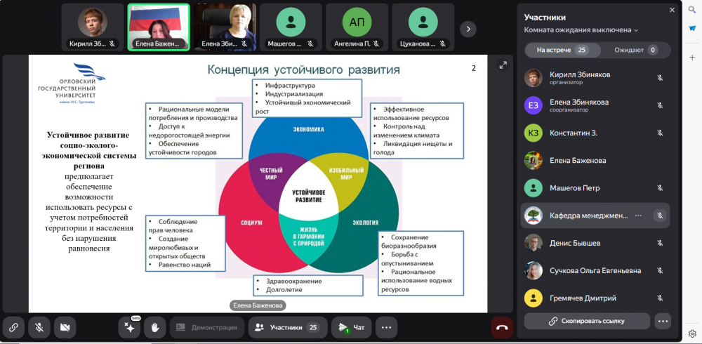 22 апреля 2025 года на базе ФГБОУ ВО «Орловский государственный университет имени И.С. Тургенева» в рамках I Всероссийской научно-практической конференции «Управление устойчивым развитием: инновации и адаптационные механизмы в условиях изменения климата в регионе» состоялось секционное заседание "Устойчивое развитие в эпоху климатических изменений", модератором секции выступала к.э.н., доцент кафедры менеджмента и государственного управления, общественный представитель АСИ в сфере "Экология" Баженова Елена Евгеньевна.