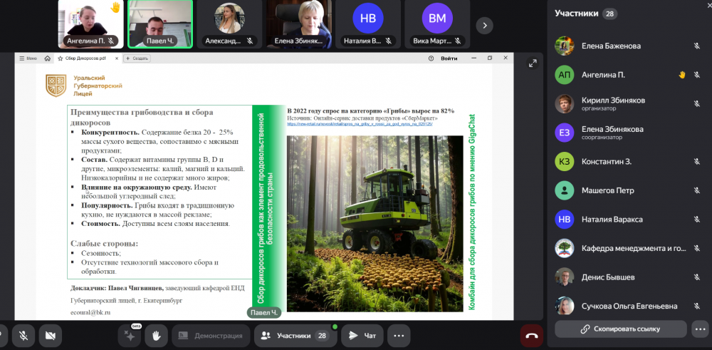 В ходе пленарного заседания были заслушаны доклады: Пасхиной Ангелины Андреевны географический факультет МГУ им. М. В. Ломоносова по исследованию динамики фитоценозов среднетаежных вторичных лесов в условиях климатических изменений отражающие вопросы, Чигвинцева Павла Вячеславовича заведующего кафедрой естественно-научных дисциплин ГАНОУ Свердловской области "Губернаторский лицей" связанные с обеспечением продовольственной безопасности, Машегова Петра Николаевича доктора экономических наук профессора кафедры информационно-коммуникационных технологий и информационного менеджмента имени В.В. Дика НОЧУ ВО "Московский университет " Синергия" проблемами и перспективами цифрового суверенитета.