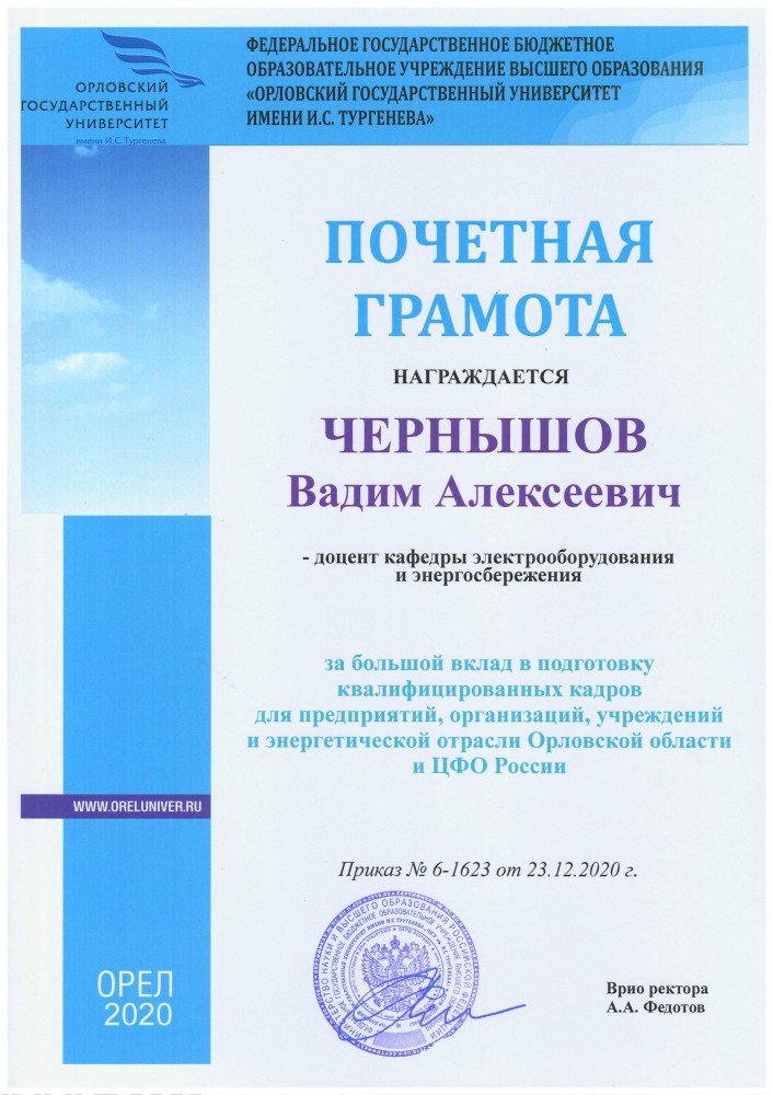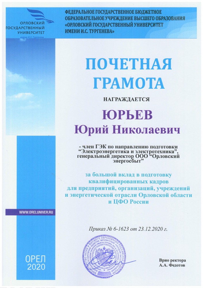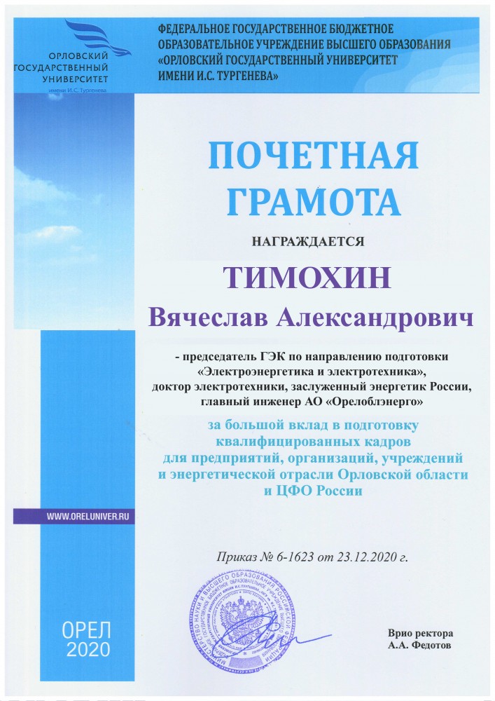 В связи с профессиональным праздником «День энергетика», а также за многолетний и добросовестный труд и личные заслуги в деле подготовки квалифицированных кадров для предприятий, организаций, учреждений и энергетической отрасти Орловской области и ЦФО России администрацией ФГБОУ ВО «ОГУ им. И.С. Тургенева» награждены почетными грамотами следующие преподаватели и представители промышленных предприятий г. Орла: