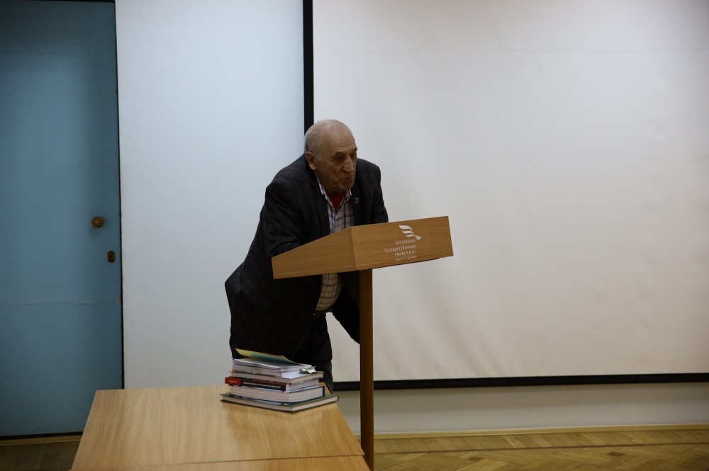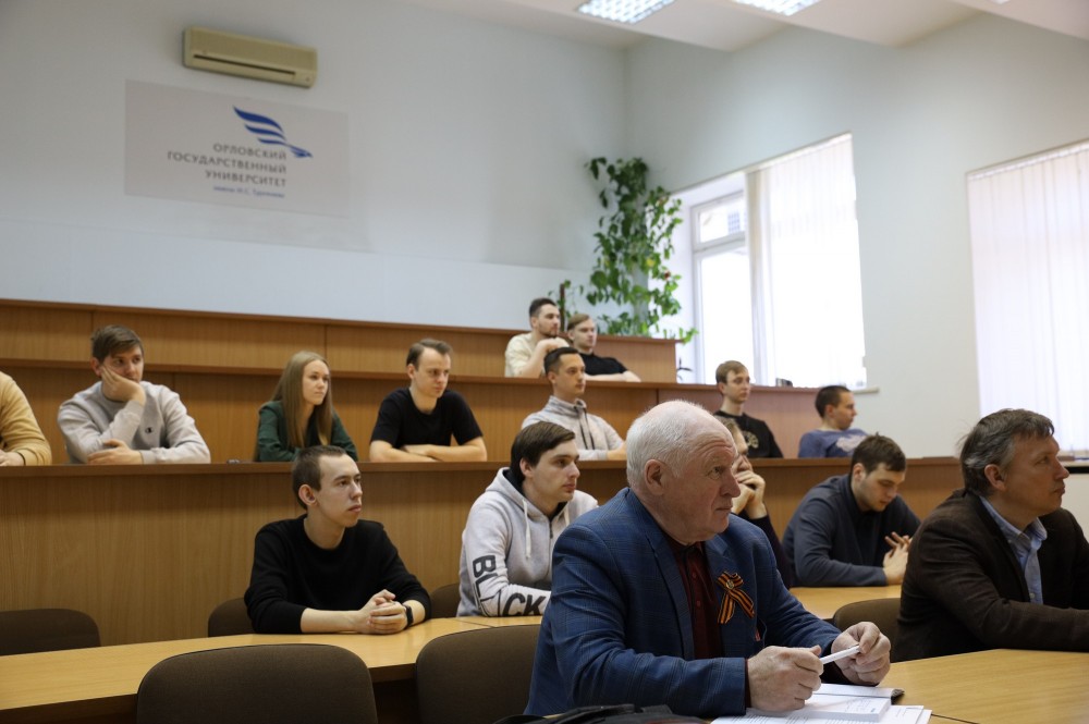 Далее слово было передано приглашенному гостю мероприятия, д.и.н., профессору Орловского государственного университета имени И.С. Тургенева, руководителю военно-исторического центра «Битва за Орел» Щекотихину Егору Егоровичу, который поделился результатами многолетних исследований в области истории периода Великой Отечественной Войны. В частности, широко были освещены события периода 1941 – 1943 г.г., произошедшие на территории Орловской области, которая в тот период являлась крупнейшим регионом и включала 66 районов и несколько крупных городов: г. Орел — административный центр, а также города Брянск, Задонск, Елец, Карачев, Клинцы, Ливны, Мценск, Севск, Трубчевск и др. Как отметил историк, «боевые действия за Орловский плацдарм по своему размаху, по своей напряженности не уступают ключевым сражениям Великой Отечественной войны», «через огненные жернова за два года перетерлось более трех миллионов солдат и офицеров противоборствующих сторон, огромное количество технических средств, предназначенных для уничтожения людей». По окончании своего рассказа Егор Егорович ответил на все вопросы аудитории и выступил с напутствием к молодому поколению.