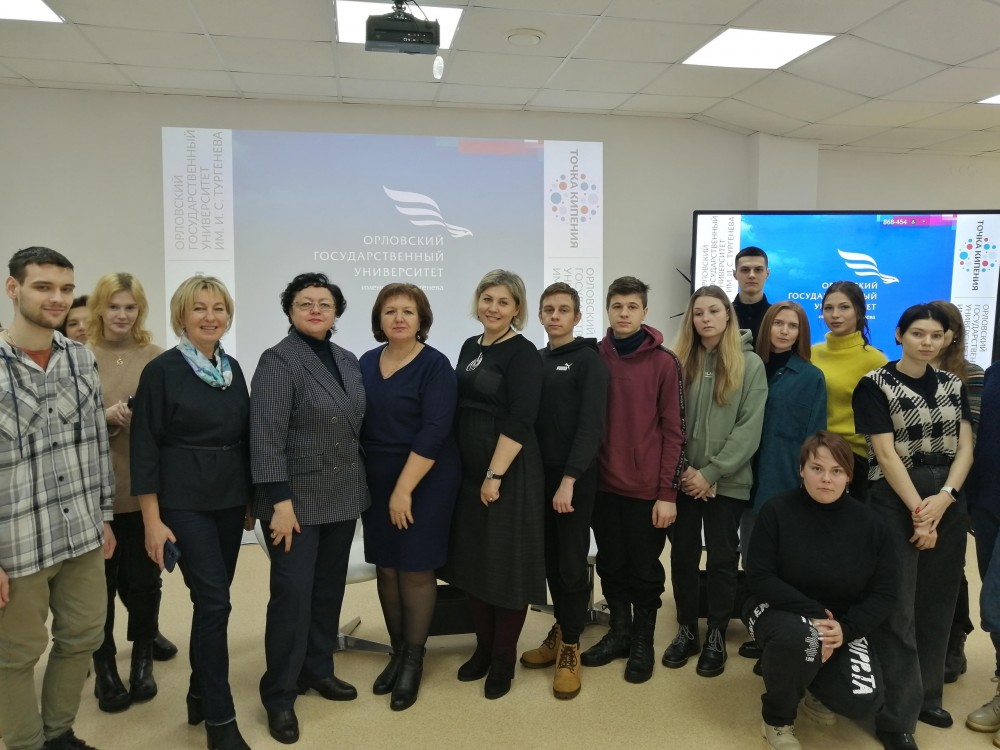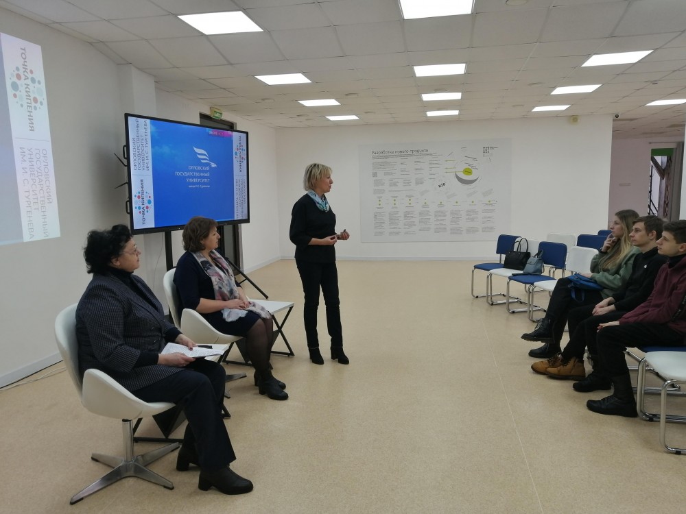 на базе «Точки кипения» ФГБОУ ВО «ОГУ имени И. С. Тургенева» состоялось профориентационное мероприятие в формате Открытого диалога со студентами учебного заведения и сотрудниками Департамента промышленности и торговли Орловской области Кочергиной В. Д. (заместителем начальника управления промышленности и торговли – начальником отдела развития торговой деятельности и общественного питания), Щиголь Е. В. (заместителем начальника отдела) и Верижниковым Я. Д. (главным специалистом отдела).
