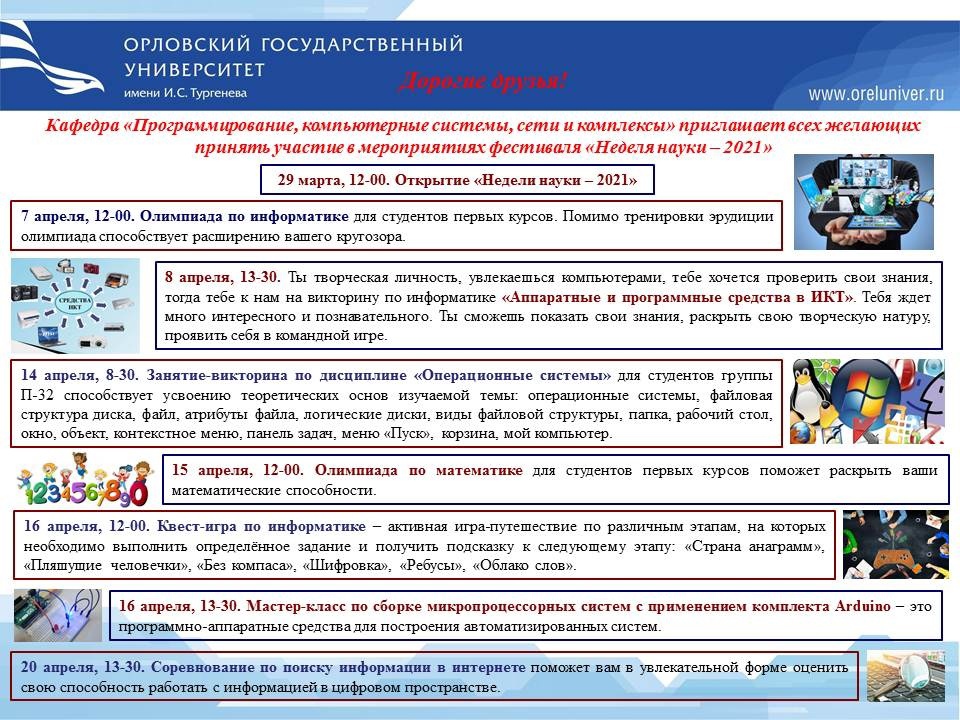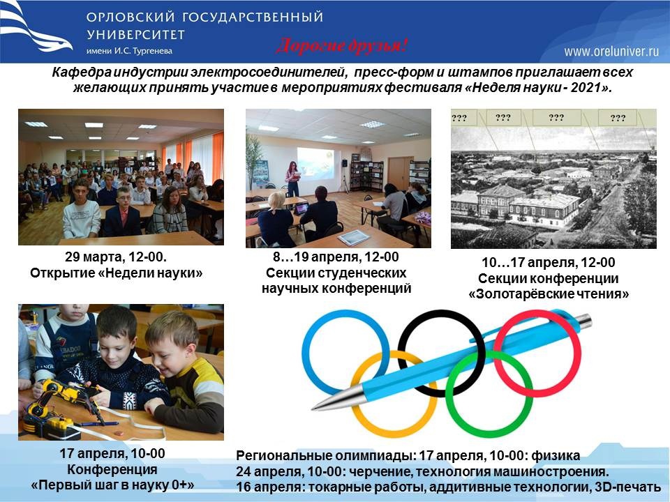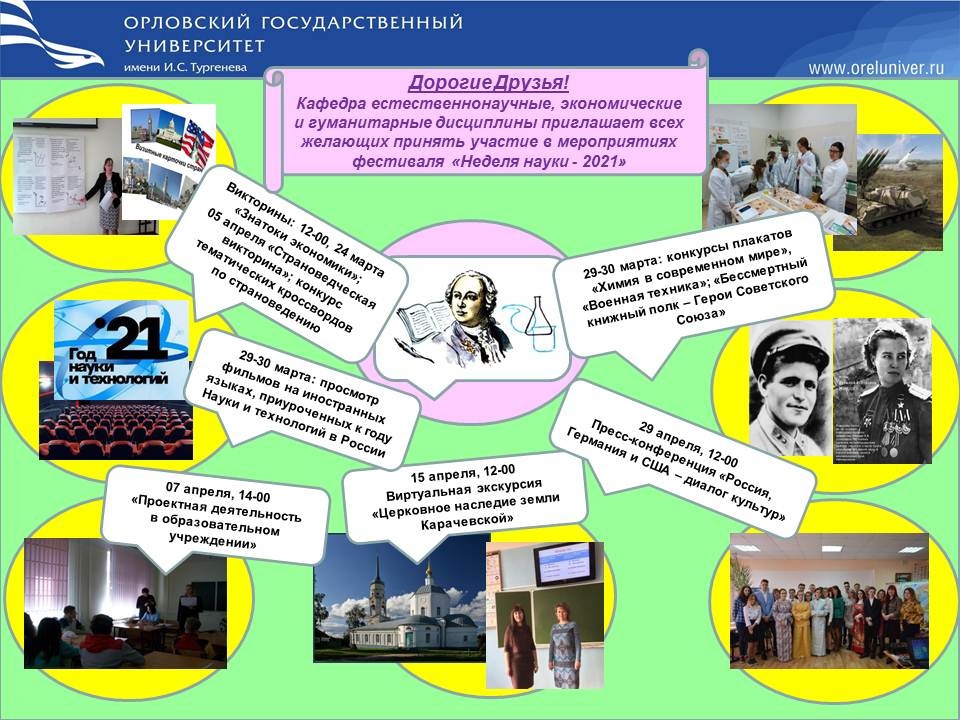 29 марта 2021 года в читальном зале Карачевского филиала ОГУ им. И.С. Тургенева, в соответствии с планом научных мероприятий ОГУ им. И.С. Тургенева, в рамках общеуниверситетской "Недели Науки 2021", состоялось торжественное открытие фестиваля науки. В рамках научного мероприятия, будут представлены результаты научно-исследовательской деятельности студентов. Заведующие выпускающими кафедрами представили анонс мероприятий. Несмотря на свое название, фестиваль науки будет проходить во всех структурных подразделениях ОГУ на протяжении месяца (с 29 марта по 30 апреля). За это время в стенах филиала университета будет проведено более 30 научных мероприятий различной направленности: международные, межрегиональные и региональные конференции, научные конкурсы и викторины, круглые столы, научно-методические семинары, студенческие форумы, мастер-классы, дискуссионные группы, фестивали научного творчества, выставки и психологические тренинги. Основными действующими лицами всех вышеперечисленных мероприятий станут не только студенты опорного вуза, некоторые из анонсированных мероприятий, подготовлены для школьников г. Карачев и Карачевского района, ведь «Неделя науки» ОГУ имени И. С. Тургенева – отличный шанс продемонстрировать свои научные знания и интересы, обсудить собственные идеи и разработки со специалистами университета. Таким образом, фестиваль науки охватывает практически всех тех, кто занимается, в той или иной степени, научной деятельностью: школьников, студентов, аспирантов и преподавателей ОГУ имени И. С. Тургенева.