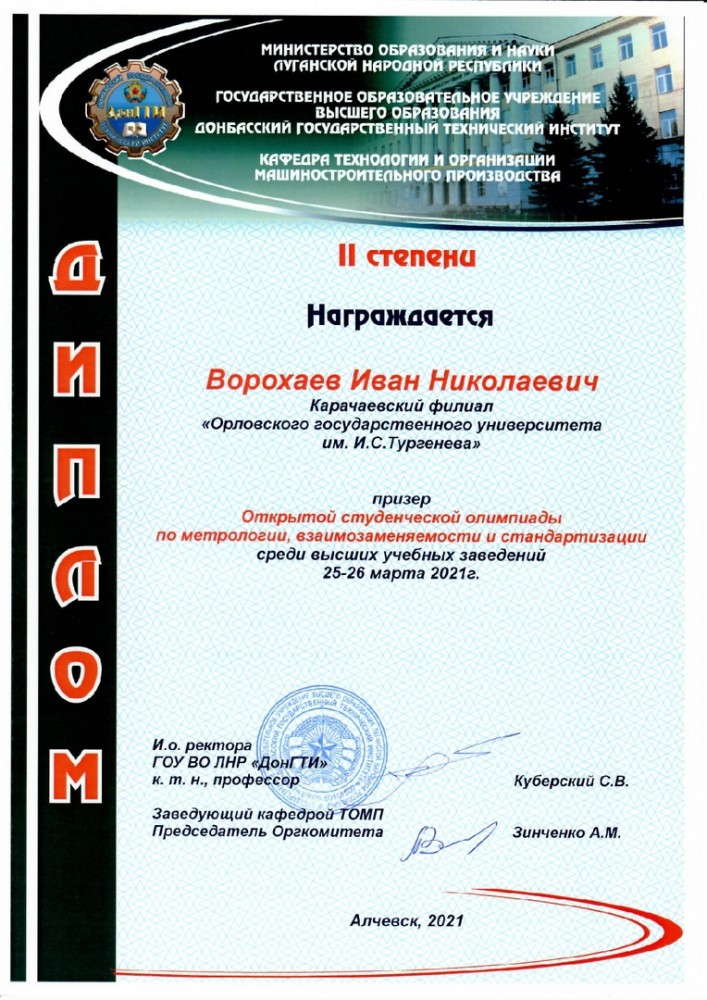 Первое мероприятие – открытая Международная олимпиада по метрологии, взаимозаменяемости и стандартизации. Олимпиада прошла в Луганской народной республике, на базе Донбасского государственного технического университета. В олимпиаде приняли участие студенты групп Т-31 и Т-41. По итогам олимпиады команда филиала заняла второе место в командном зачёте, а студент группы Т-41 Иван Ворохаев – второе место в личном зачёте. Поздравляем победителей!