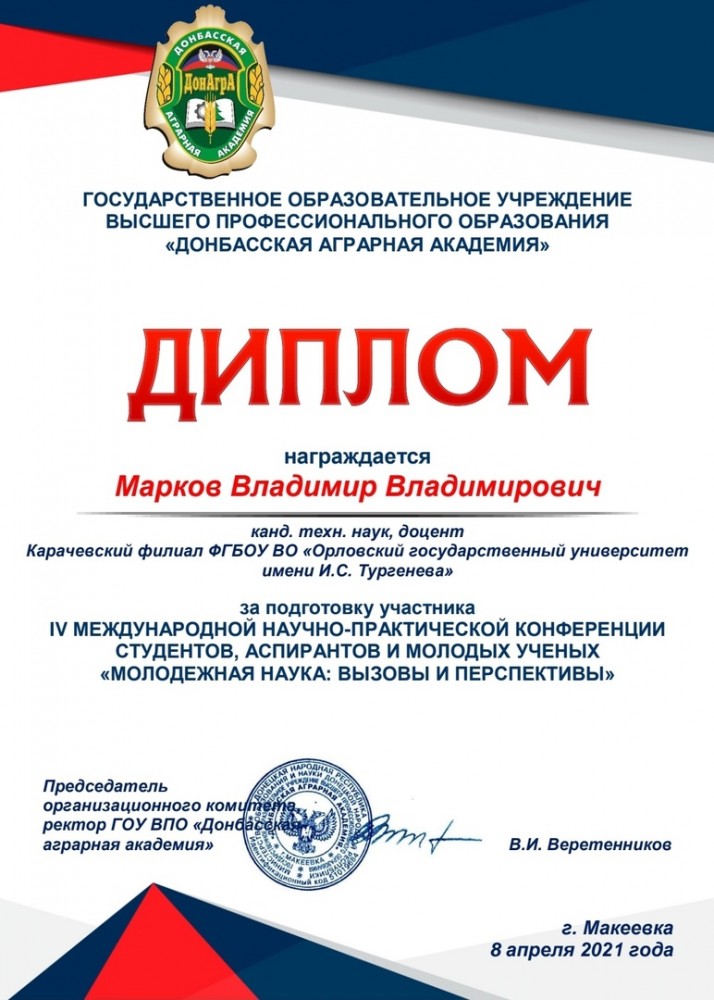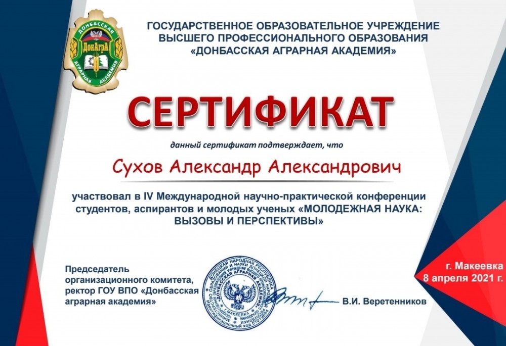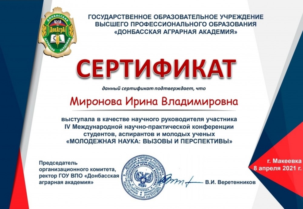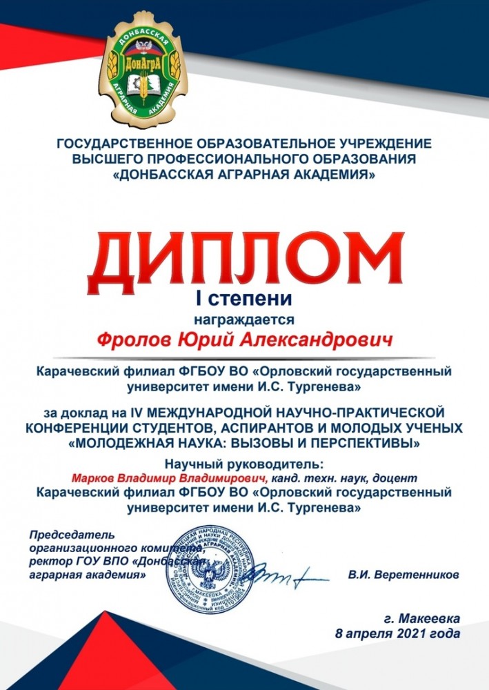 Продолжением «Недели индустрии» стало участие студентов филиала в IV Международной научно-практической конференции студентов, аспирантов и молодых ученых «Молодежная наука: вызовы и перспективы». Конференция прошла в Донецкой народной республике, на базе Донецкой аграрной академии, в форме Зум-конференции. По итогам конкурса научная работа студента группы Т-31 Юрия Фролова «Результаты исследований надёжности светодиодных ламп» заняла первое место.