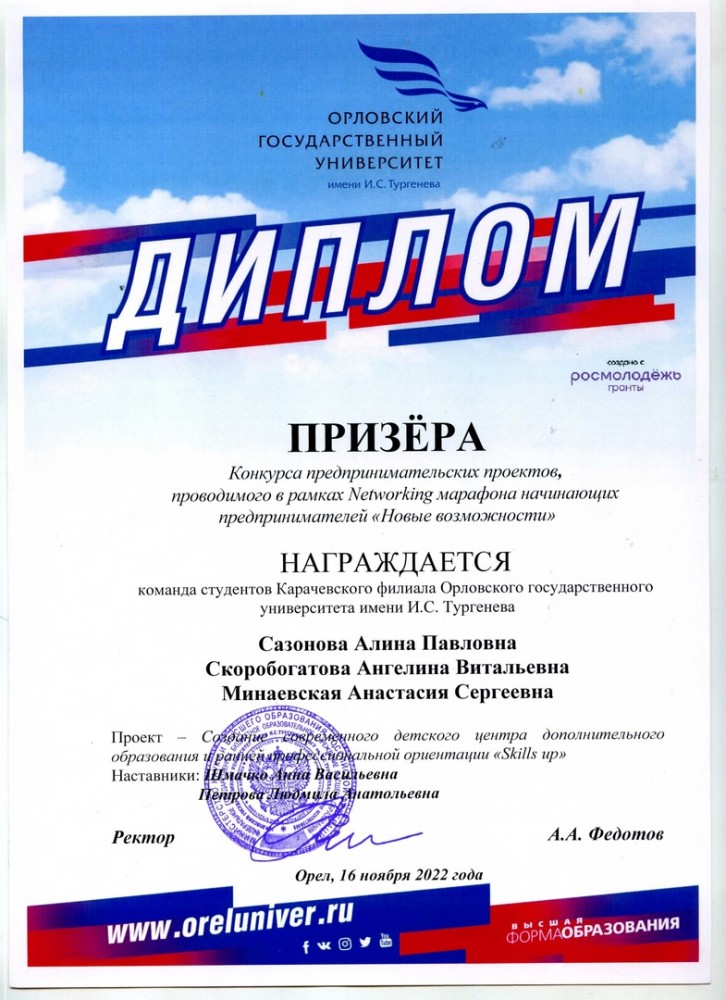 Студенты четвертого курса специальности «Технология аналитического контроля химических соединений» Сазонова Алина Павловна, Скоробогатова Ангелина Витальевна, Минаевская Анастасия Сергеевна награждены Дипломом Призера конкурса предпринимательских проектов. Проект: Создание современного детского центра дополнительного образования и ранней профессиональной ориентации «Skills up». Наставники проекта: Шмачко Анна Васильевна, Петрова Людмила Анатольевна.