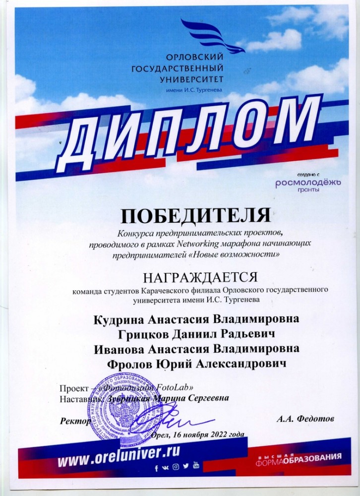 По итогам проведения Марафона студенты первого курса направления подготовки «Конструкторско-технологическое обеспечение машиностроительных производств» Кудрина Анастасия Владимировна, Грицков Даниил Радьевич, Иванова Анастасия Владимировна, Фролов Юрий Александрович награждены Дипломом Победителя конкурса предпринимательских проектов. Проект: Открытие современной фотостудии «Фотодизайн Fotolab». Наставник проекта: Зубрицкая Марина Сергеевна.