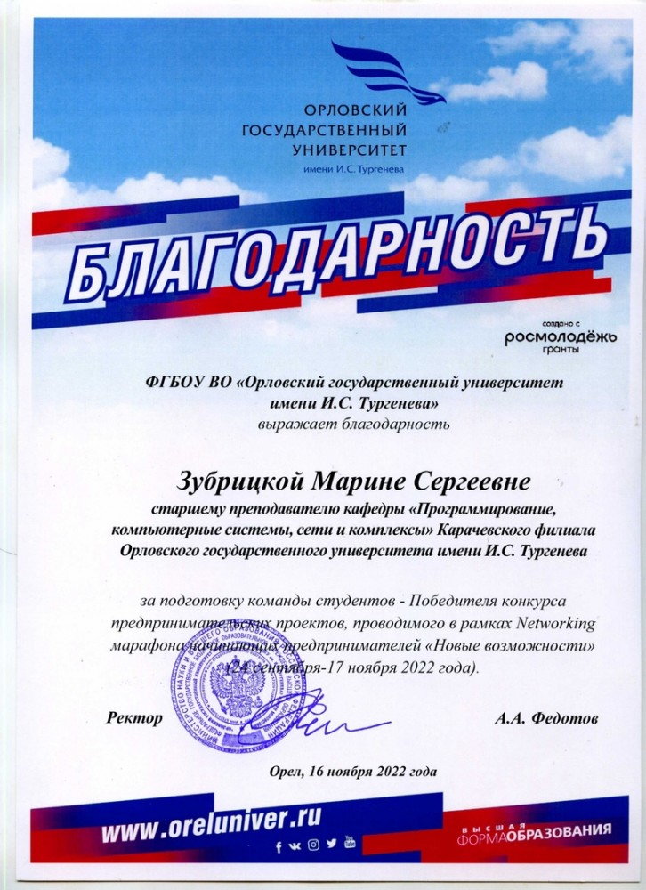В период с 25 октября по 15 ноября студенты Карачевского филиала ОГУ имени И.С. Тургенева приняли участие в Networking-марафоне начинающих предпринимателей «Новые возможности», проводимого совместно с Ассоциацией развития финансовой грамотности, Орловским региональным ВЭО России, Орловским региональным отделением Общероссийской общественно-государственной просветительской организации «Российское общество «Знание».