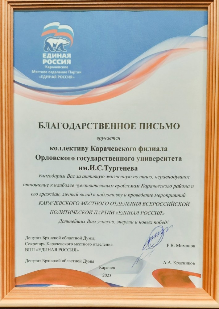 Благодарственным письмом награждён коллектив Карачевского филиала ОГУ им. И.С. Тургенева