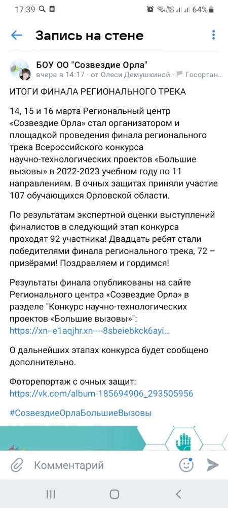 Поздравляем студента филиала с успешным участием во Всероссийском конкурсе научно-технических проектов «Большие вызовы» (Региональный трек) с элементами научной школы. Мероприятие проходило в очном формате 15 марта 2023г. на базе Регионального центра «Созвездие Орла».