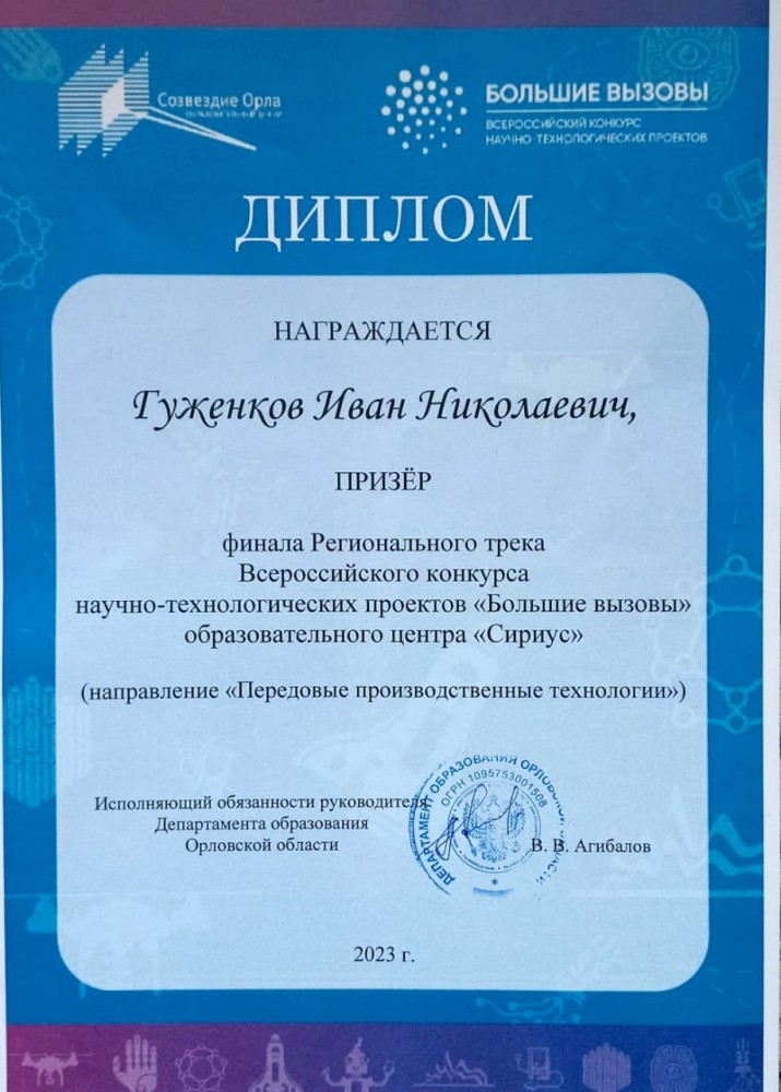 Поздравляем студента гр. ИБ-21 Гуженкова Ивана с успешным участием в Региональном треке Всероссийского конкурса научно-технологических проектов «Большие вызовы», проводимого на базе ФГБОУ ВО «Орловский государственный аграрный университет имени Н.В. Парахина», г. Орёл.