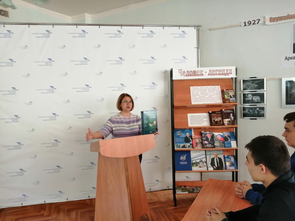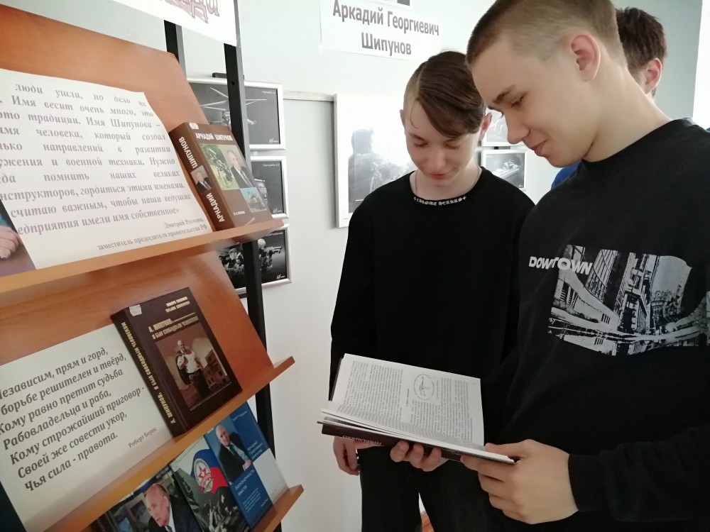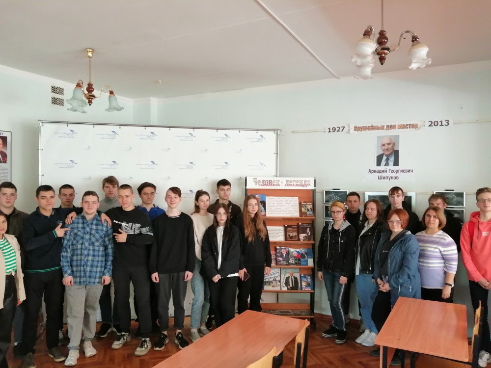 В читальном зале филиала сотрудники библиотеки подготовили выставку-обзор литературы на тему «Человек-легенда», посвященную выдающемуся конструктору-оружейнику, руководителю и генеральному конструктору Тульского конструкторского бюро приборостроения (1962—2006 г.г.), почетному гражданину г. Тулы и г. Ливны - Шипунову А.Г. Заведующая библиотекой Алифанова Т.И. сообщила обучающимся группы А21 краткую биографию знаменитого земляка, представила издания книг: дочери конструктора Т. Шипуновой (Саклаковой) «Мой отец - генеральный конструктор», «Будни генерального», Коровина В.Н. «Аркадий Шипунов», «Генеральный конструктор А.Г. Шипунов" и др.