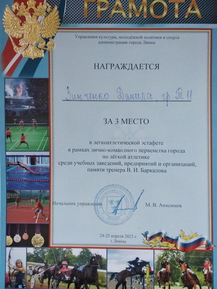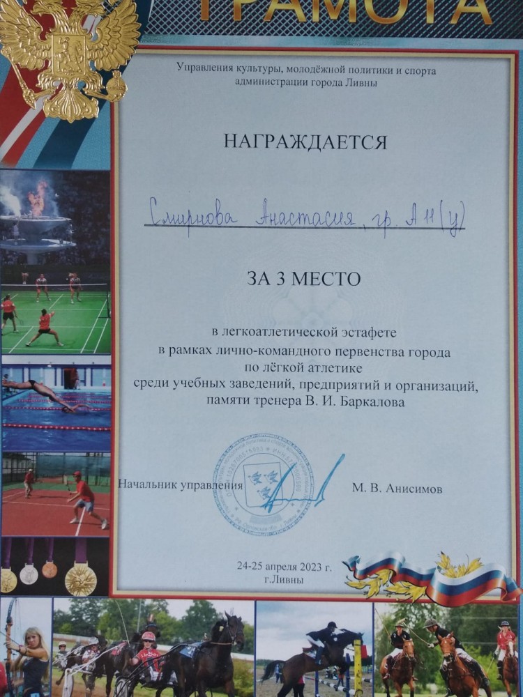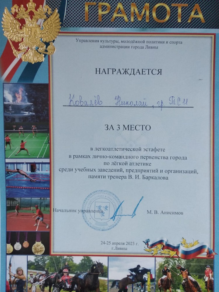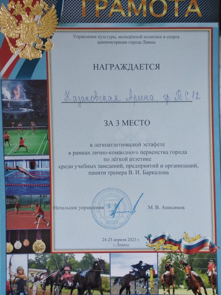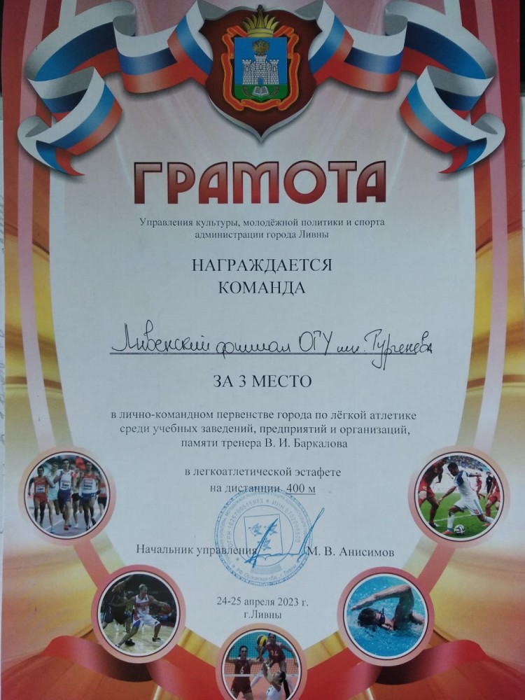 5 мая 2023г. на стадионе муниципального автономного учреждения «Физкультурно-оздоровительный комплекс» г. Ливны проводилось лично-командное первенство по легкой атлетике среди муниципальных, бюджетных общеобразовательных учреждений, учебных заведений, посвященное памяти тренера В.И. Баркова, а также легкоатлетическая эстафета (4х100м), посвященная 78-й годовщине Победы советского народа в Великой Отечественной войне.