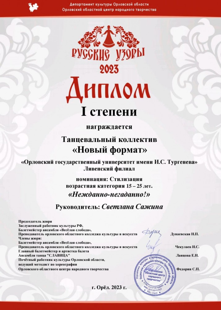 В марте 2023г. в центре молодежи «Лидер» состоялся Межобластной фестиваль «Русские узоры – 2023», посвященный Международному Дню танца, в котором принял участие танцевальный коллектив филиала «Новый формат». Исполнительское мастерство, сценичность, артистизм, раскрытие художественного образа: такими критериями оценивалось мастерство участников фестиваля «Русские узоры – 2023».
