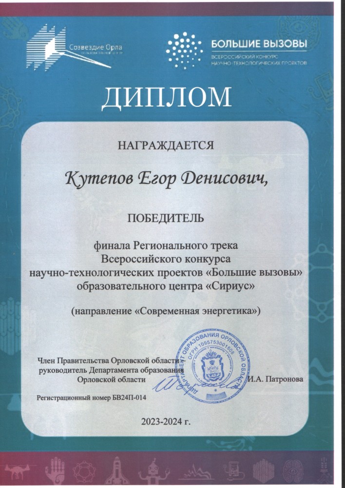 29 мая 2024г. в торжественной обстановке в Региональном центре «Созвездие Орла» вручены дипломы победителей и призеров участникам регионального трека Всероссийского конкурса научно-технологических проектов образовательного центра «Сириус» «Большие вызовы». Диплом победителя был вручен студенту гр. ИБ-21 Кутепову Е. по направлению «Современная энергетика», а дипломом призера по направлению «Передовые производственные технологии» отмечена работа студента гр. Т-21 Горностаева П.