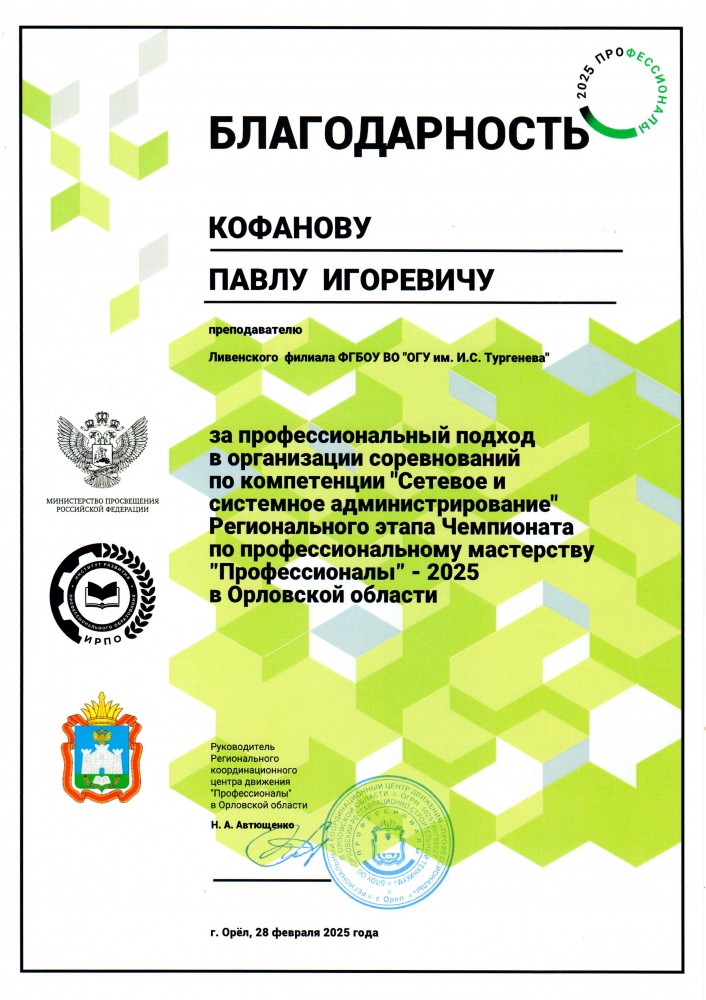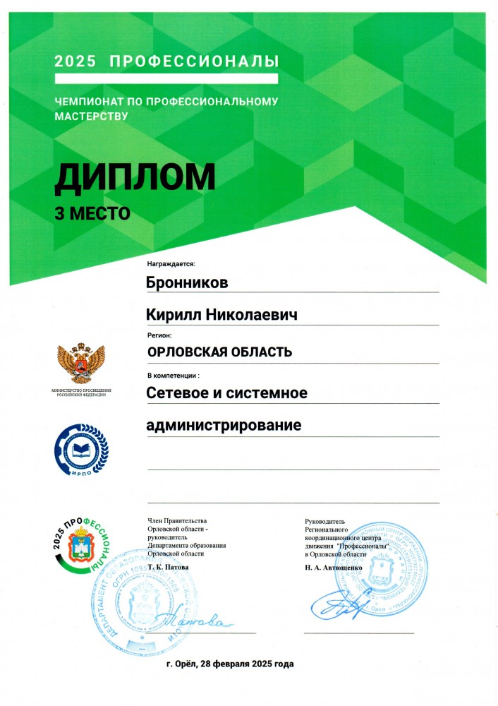 Студент 3 курса специальности 10.02.05 Обеспечение информационной безопасности автоматизированных систем Бронников Кирилл принимал участие в региональном этапе чемпионата по профессиональному мастерству «Профессионалы - 2025» в Орловской области и занял 3 место в компетенции «Сетевое и системное администрирование». Организацией и подготовкой студента к соревнованиям занимался преподаватель кафедры информационных технологий и экономики Кофанов П.И. Поздравляем Кирилла с успешным участием и желаем дальнейших успехов!