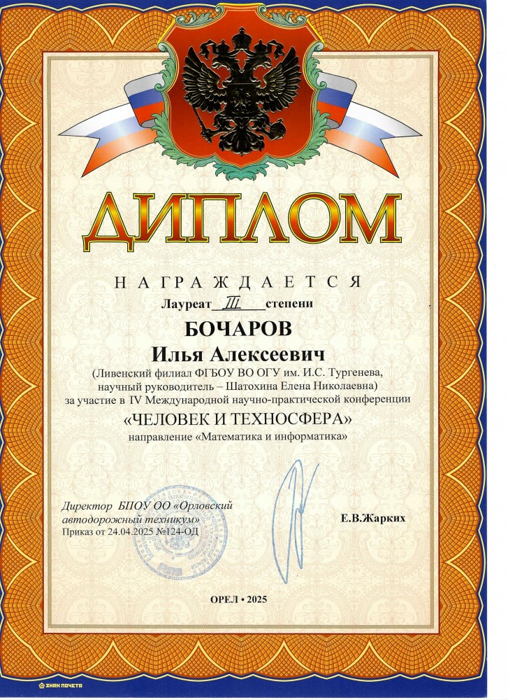 Поздравляем студентов филиала с успешным участием в IV Международной научно-практической конференции «Человек и техносфера» (24 апреля 2025г.). Ежегодно конференция проходит на базе БПОУ ОО «Орловский автодорожный техникум», г. Орёл.