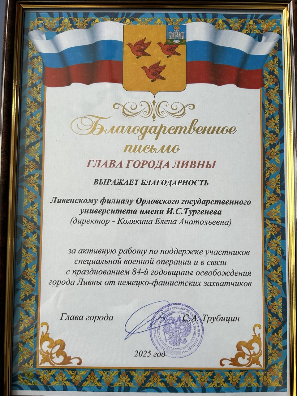 Коллектив Ливенского филиала ОГУ им. И.С.Тургенева был награждён благодарственным письмом главы города за активную работу по поддержке участников СВО.