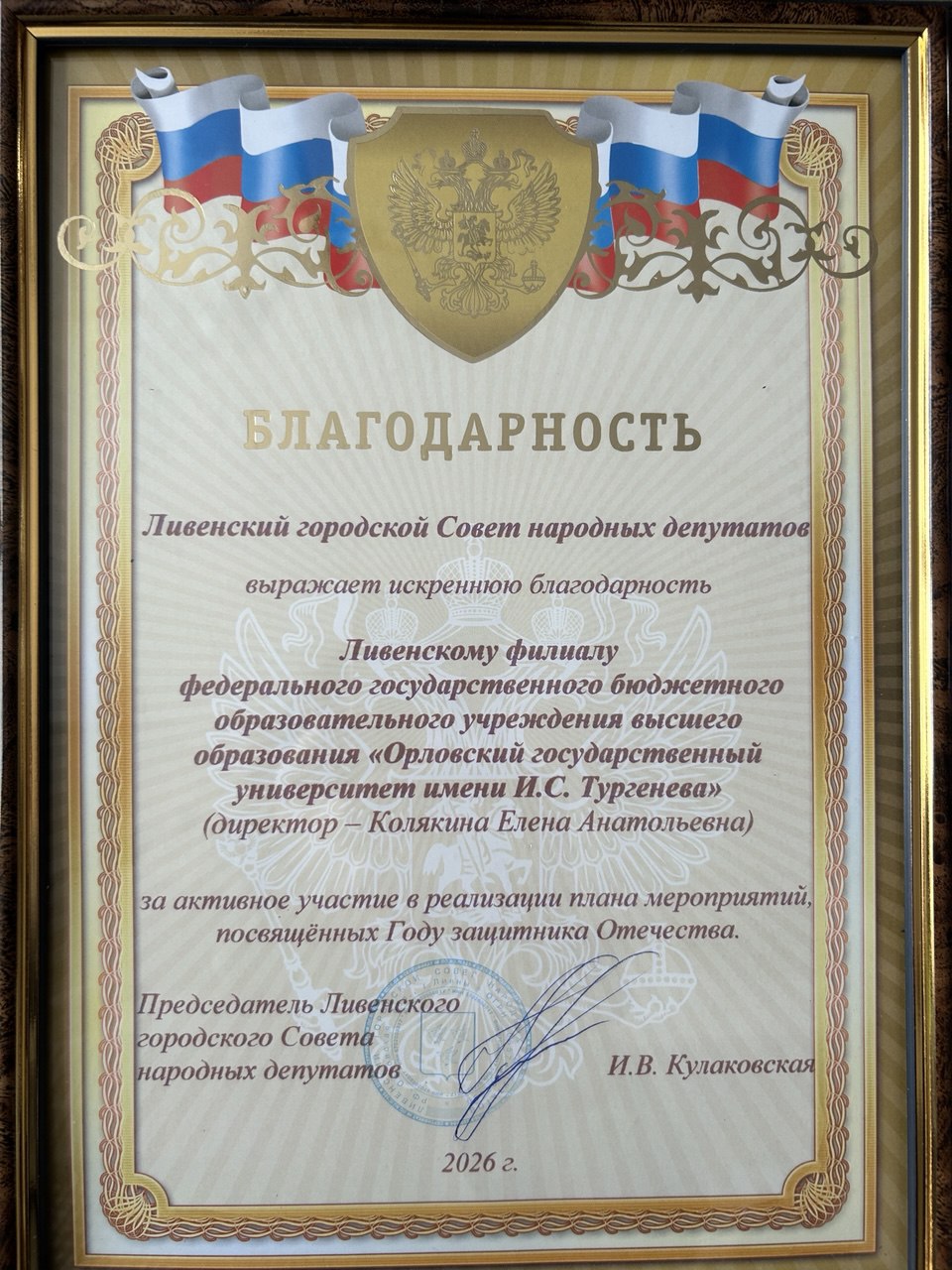 За активное участие в организации мероприятий, посвященных Году защитника Отечества, Ливенский филиал ОГУ им. И.С. Тургенева был награжден благодарностью Ливенского городского Совета народных депутатов.