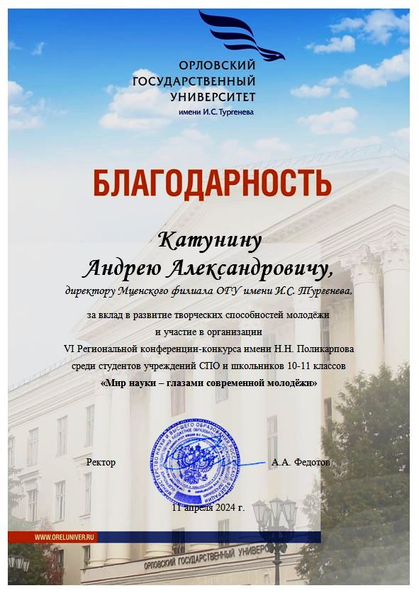 11.04.2024 года на базе Политехнического института им. Н.Н.Поликарпова ФГБОУ ВО «Орловский государственный университет имени И.С.Тургенева» прошла VI региональная конференция-конкурс имени Н.Н.Поликарпова среди студентов учреждений СПО и школьников 10-11 классов. Обучающиеся Мценского филиала под руководством преподавателя кафедры ООД Ильиновой Е.А. приняли участие в работе секции «Гуманитарные науки: истори». Обучающиеся гр. Зм-1-395 Горлова Елизавета и Деменина Анастасия представили исследовательскую работу по теме: «Военная хитрость советских военачальников при проведении боевых операций в ВОВ» и заняли 2 место. Обучающаяся гр. Гд-2-387 Шахова Мария защитила исследовательскую статью по теме: «Эволюция российского самосознания после революции 1905-1907года» и заняла 3 место. Научный