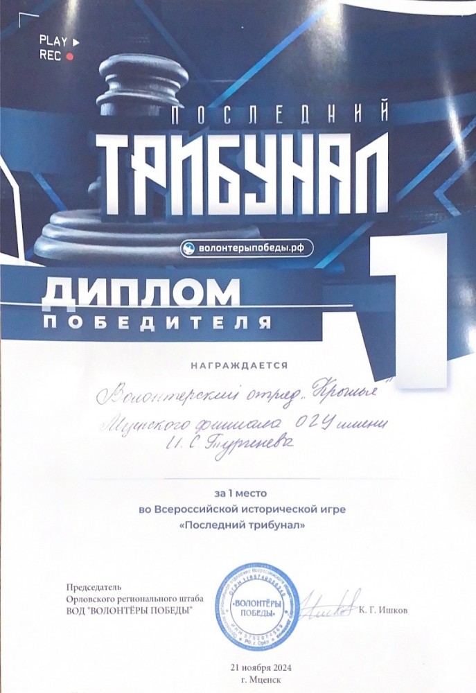 По итогам игры волонтерский отряд «Крылья» Мценского филиала ОГУ имени И.С. Тургенева стал обладателем 1 места! Поздравляем наших волонтеров.