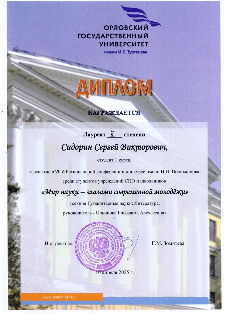 10.04.2025г. на базе Политехнического института им. Н.Н. Поликарпова ФГБОУ ВО «Орловский государственный университет имени И.С. Тургенева» прошла VII региональная конференция-конкурс имени Н.Н. Поликарпова среди студентов учреждений СПО и школьников 10-11 классов.