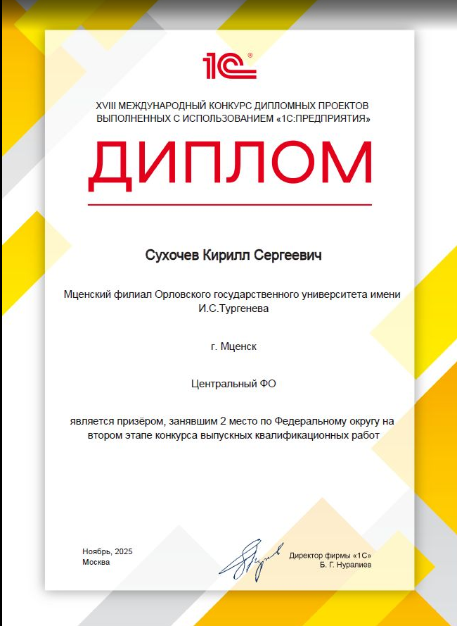 Выпускник Мценского филиала ОГУ им. И.С. Тургенева специальности 09.02.07 Информационные системы и программирование Сухочев Кирилл стал призером Международного конкурса выпускных квалификационных работ, выполненных с использованием программных продуктов 1С.
