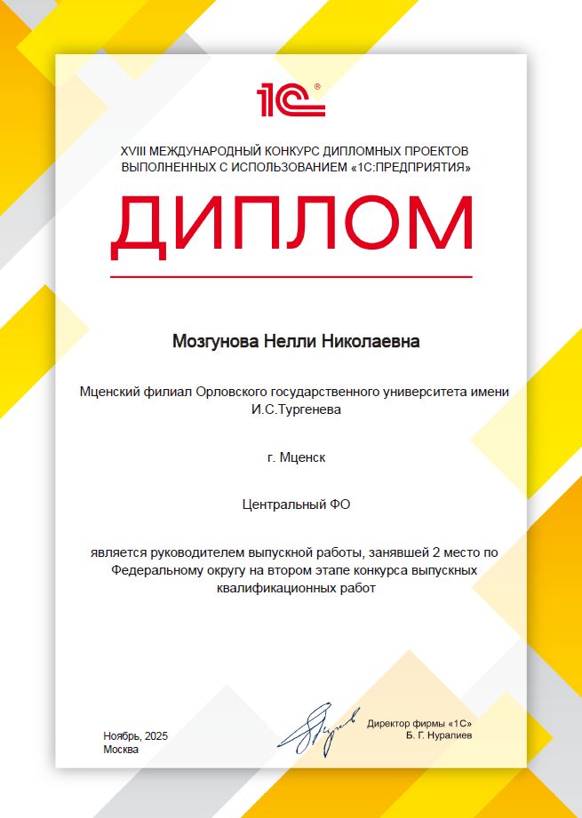 Кирилл Сухочев выполнил дипломный проект на тему «Модификация конфигурации «1С:Бухгалтерия» на основе внедрения модуля «Планировщик задач» (на материалах Администрации г. Мценска)» под руководством преподавателя Мозгуновой Н.Н.