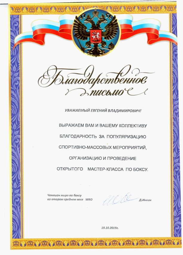 19 октября 2019г. года на базе спортивного зала Мценского филиала (ул.Тургенева, 85) прошел открытый мастер-класс по боксу, который провели Денис Инкин — российский боксёр-профессионал, выступавший во 2-й средней весовой категории, чемпион мира во 2-м среднем весе по версии WBO в 2008 году и Тиганов Кирилл - руководитель секции бокса Мценского филиала «TIGANOV BOXING TEAM». На мастер- классе присутствовали представители школ бокса: «Левша» п.Верховье Орловской области, БУ ОО СШОР №2 г.Мценска, г.Серпухов, г.Чехов.