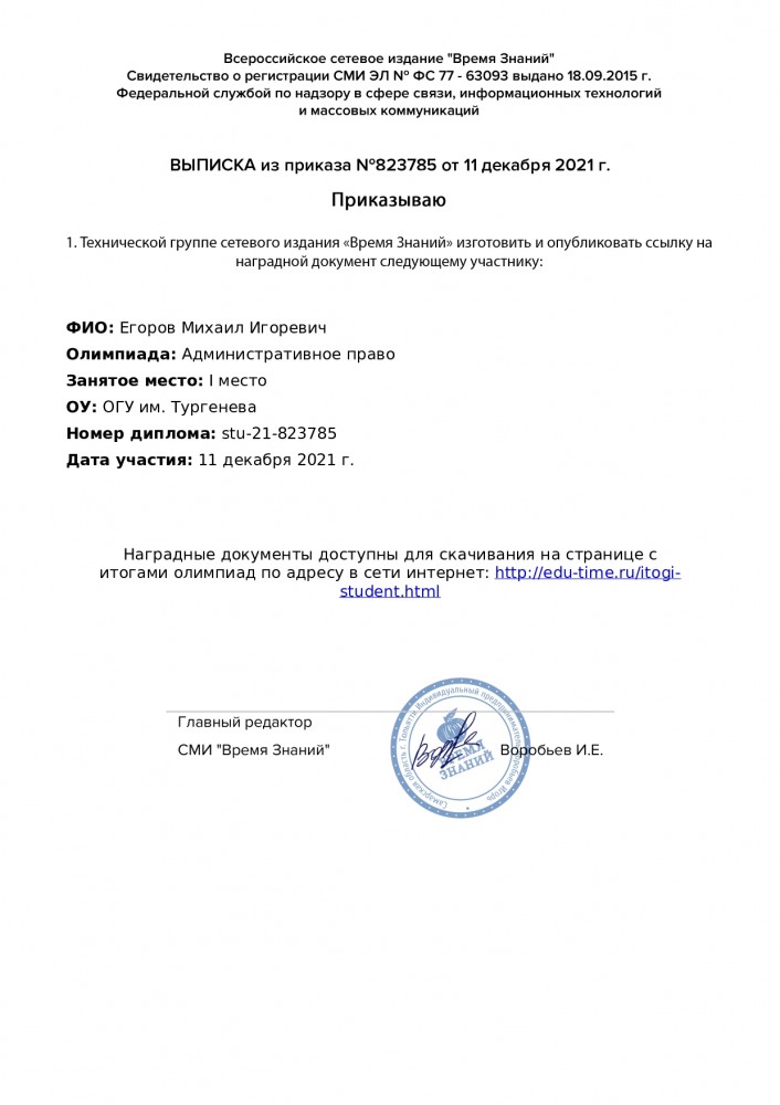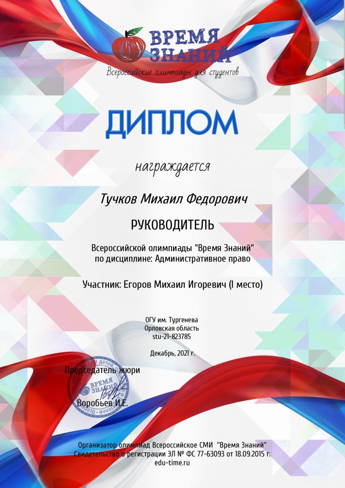 11 декабря 2021 г. Егоров Михаил Игоревич, студент 2 курса Юридического института занял I место во Всероссийской олимпиаде «Время знаний» по дисциплине Административное право. Руководитель: Тучков Михаил Федорович, к.ю.н., доцент кафедры конституционного, административного и финансового права. (Всероссийское СМИ «Время знаний», 11 декабря 2021 г.)