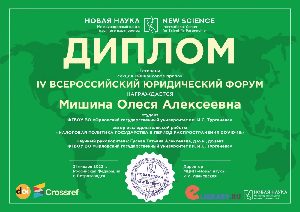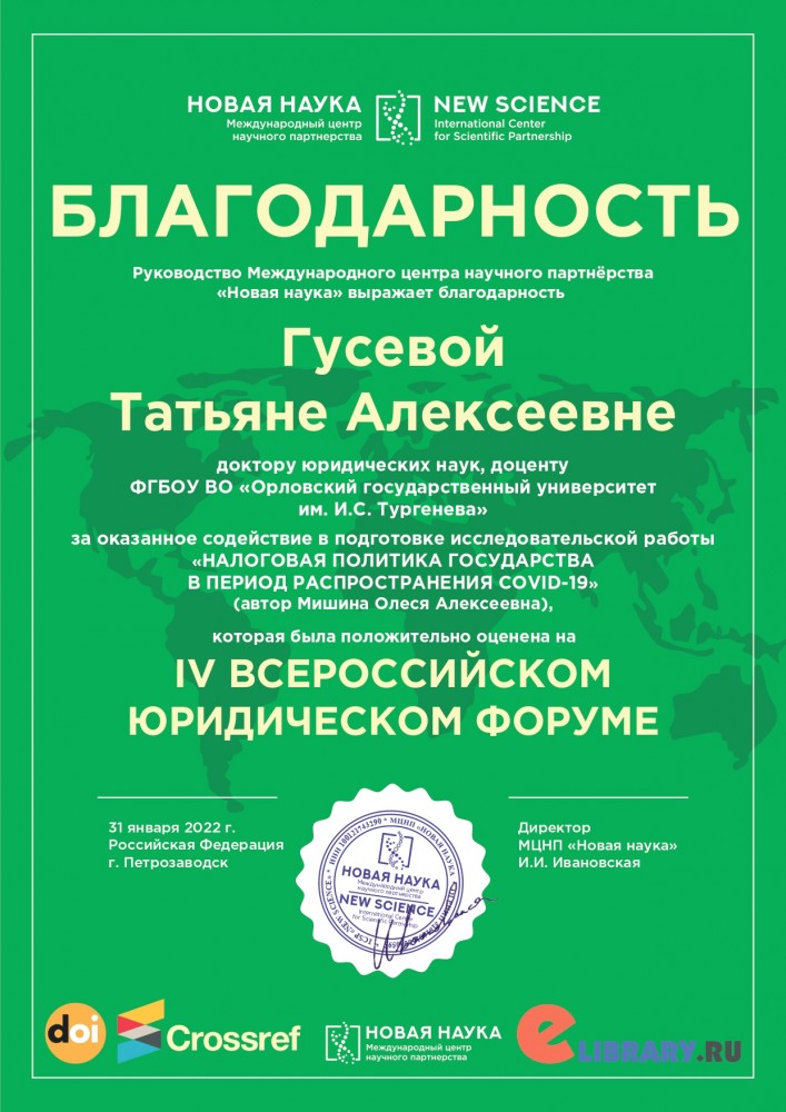 Благодарность Гусевой Татьяне Алексеевне, д.ю.н., доценту выражает Международный центр научного партнерства «Новая наука» за оказанное содействие в подготовке исследовательской работы «Налоговая политика государства в период распространения COVID-19» (автор Мишина Олеся Алексеевна), которая была положительно оценена на IV Всероссийском юридическом форуме.