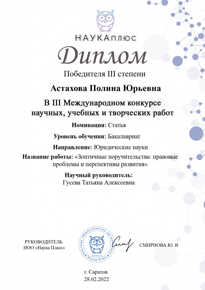 Астахова Полина Юрьевна, студентка 4 курса юридического института награждена Дипломом Победителя III степени III Международного конкурса научных, учебных и творческих работ. Научная статья: «Зонтичные поручительства: правовые проблемы и перспективы развития». Научный руководитель: Гусева Татьяна Алексеевна (г. Саратов, НОО «Наука Плюс», 28.02.2022 г.)