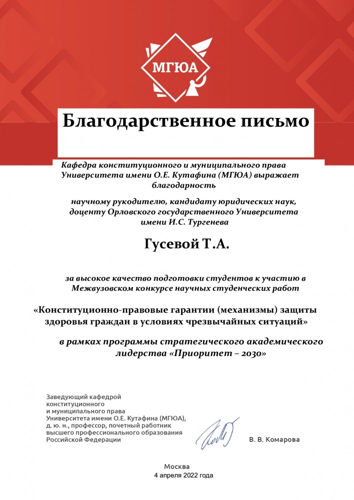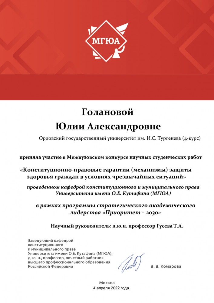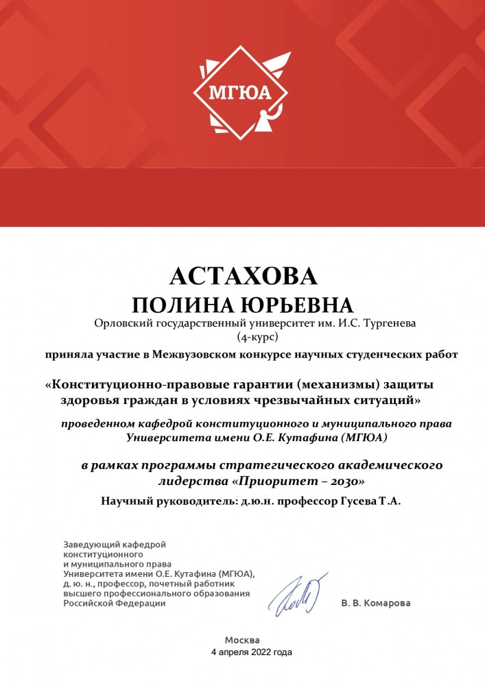 04.04.2022 г. Студентки 4 курса юридического института Астахова Полина Юрьевна, Голанова Юлия Александровна и Ушакова Юлия Вадимовна приняли участие в Межвузовском конкурсе научных студенческих работ «Конституционно-правовые гарантии (механизмы) защиты здоровья граждан в условиях чрезвычайных ситуаций», проведенном кафедрой конституционного и муниципального права Университета имени О.Е. Кутафина (МГЮА) в рамках программы стратегического академического лидерства «Приоритет-2030». Научный руководитель: д.ю.н., доцент, профессор кафедры конституционного, административного и финансового права Гусева Т.А. (Москва, 04.04.2022 г.)