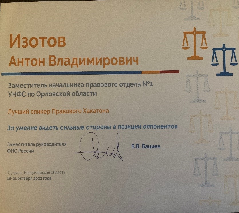 Изотов А.В. был признан лучшим спикером Правового Хакатона на правовом форуме в ЦФО, который был организован по инициативе Федеральной налоговой службы России, проходившем в г. Суздале 18-21 октября 2022 года и объединившем лучших налоговых юристов. Цель правового форума налоговиков в ЦФО – создать благоприятные условия для профессионального развития.На Правовом форуме в г. Суздале обсуждались актуальные проблемы налогового регулирования и вырабатывались инструменты для их решения. Форум собрал ведущих экспертов России в области налогообложения.