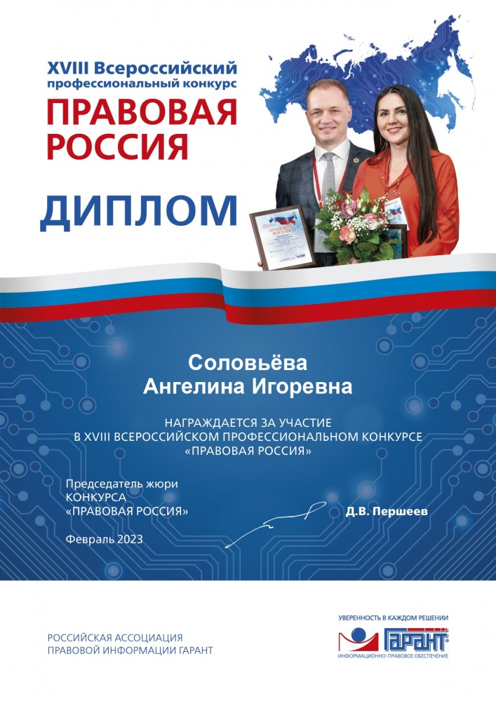 В феврале 2023 г. студенты Юридического института приняли участие в ХVIII Всероссийском профессиональном Конкурсе «Правовая Россия». Организатором ХVIII Всероссийского профессионального Конкурса «Правовая Россия» является Российская Ассоциация правовой информации ГАРАНТ. Выданы дипломы, подтверждающие участие студентов ЮИ в конкурсе