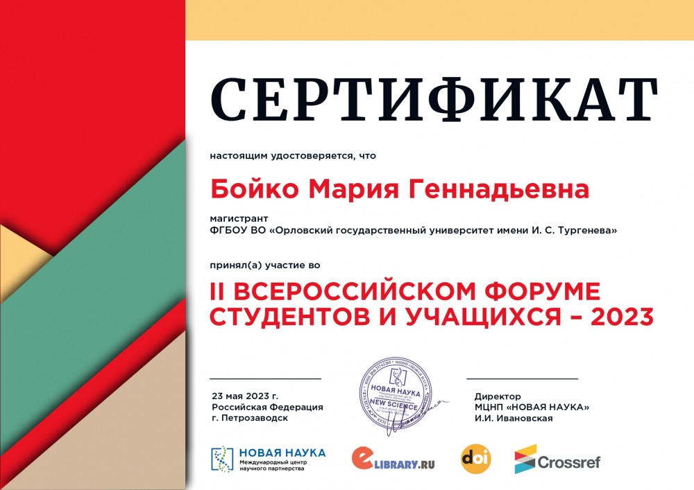 23 мая 2023 г. Бойко Мария Геннадьевна приняла участие во II Всероссийском форуме студентов и учащихся – 2023, состоявшемся в г. Петрозаводске, МЦНП «НОВАЯ НАУКА». Научная работа: ПРАВОВОЙ РЕЖИМ РЕПРОДУКТИВНОГО БИОЛОГИЧЕСКОГО МАТЕРИАЛА ДЛЯ ЦЕЛЕЙ ПОСТМОРТАЛЬНОЙ РЕПРОДУКЦИИ. Выдан сертификат участника.