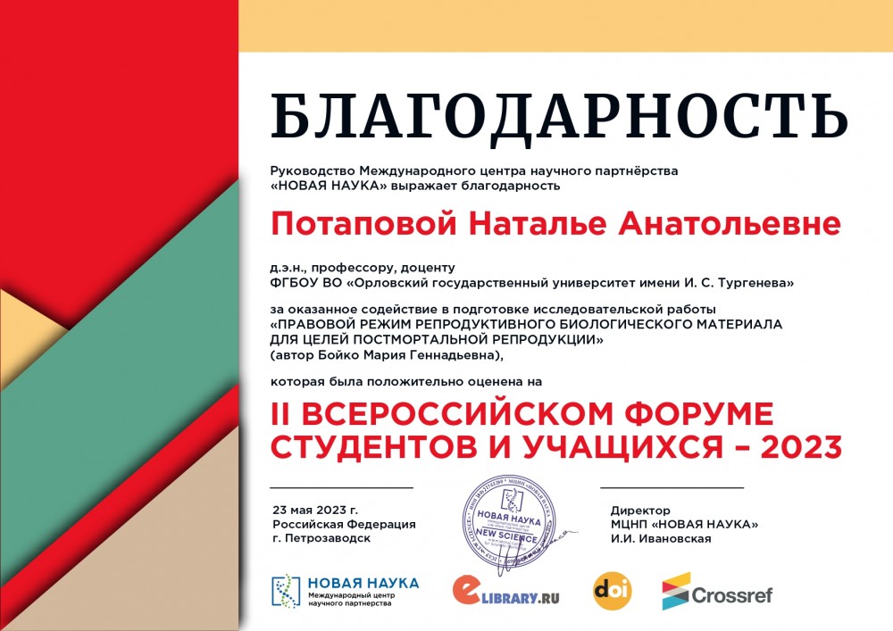 Благодарность Потаповой Н.А. за оказанное содействие в подготовке исследовательской работы «ПРАВОВОЙ РЕЖИМ РЕПРОДУКТИВНОГО БИОЛОГИЧЕСКОГО МАТЕРИАЛА ДЛЯ ЦЕЛЕЙ ПОСТМОРТАЛЬНОЙ РЕПРОДУКЦИИ» (автор Бойко Мария Геннадьевна), которая была положительно оценена на II ВСЕРОССИЙСКОМ ФОРУМЕ СТУДЕНТОВ И УЧАЩИХСЯ – 2023.