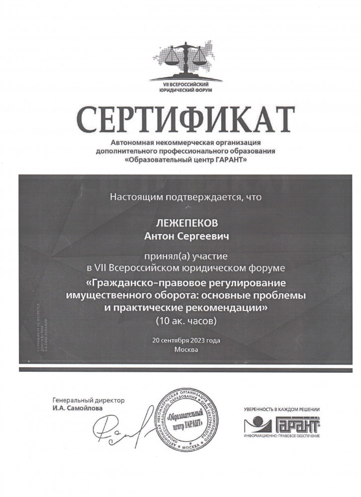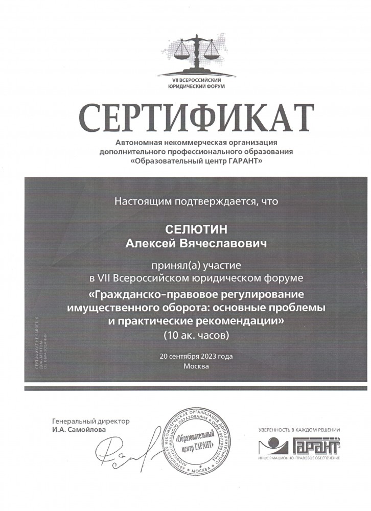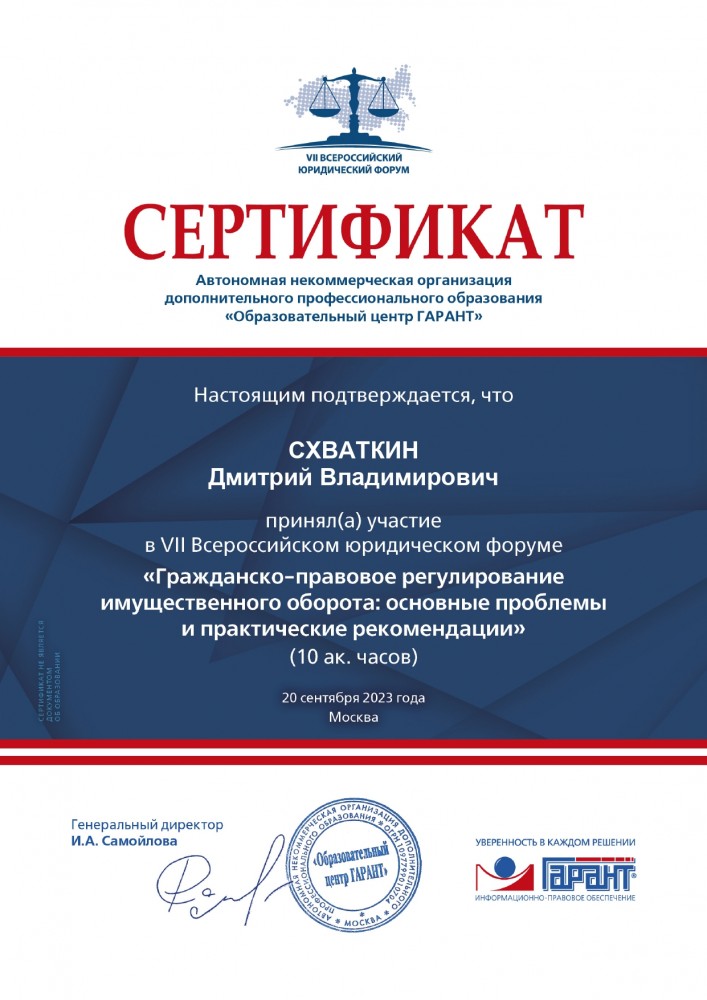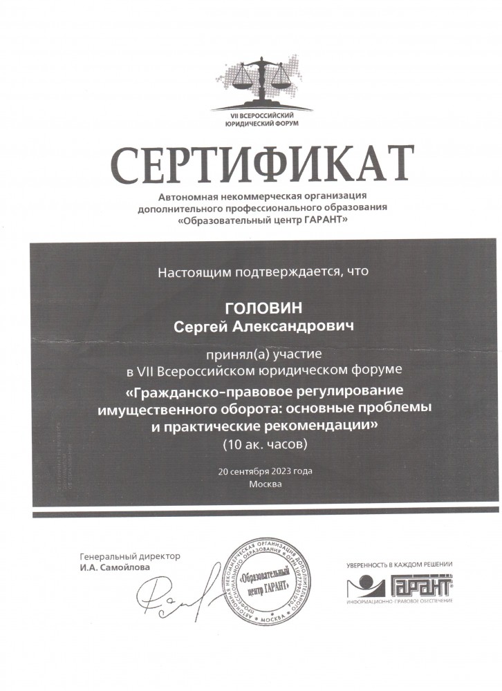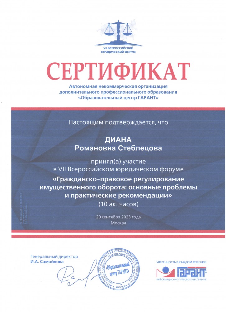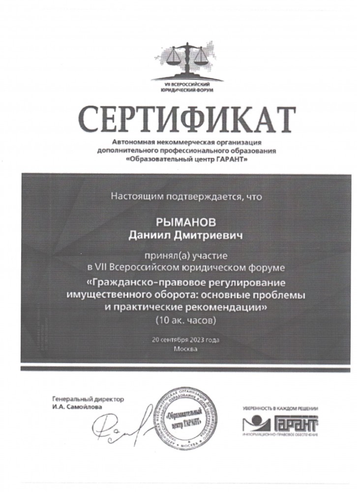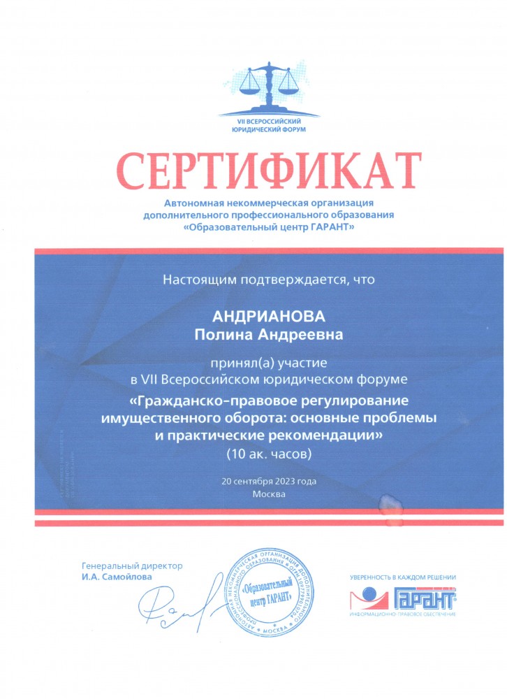 20 сентября 2023 г. участие студентов 4 курса юридического института в VII Всероссийском юридическом форуме «Гражданско-правовое регулирование имущественного оборота: основные проблемы и практические рекомендации» (10 ак. часов). Автономная некоммерческая организация дополнительного профессионального образования «Образовательный центр Гарант»: